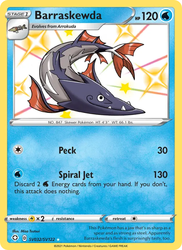 This Pokémon has a jaw that's as sharp as a spear and as strong as steel. Apparently Barraskewda's flesh is surprisingly tasty, too.