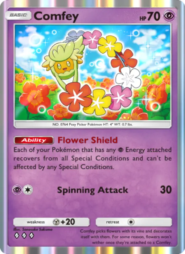 Comfey picks flowers with its vine and decorates itself with them. For some reason, flowers won't wither once they're attached to a Comfey.