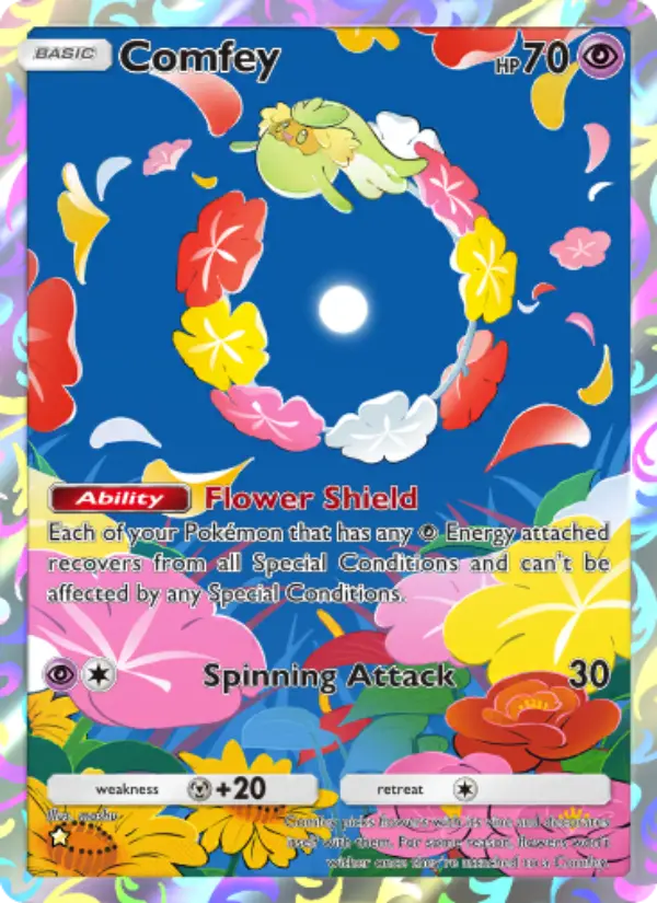 Comfey picks flowers with its vine and decorates itself with them. For some reason, flowers won't wither once they're attached to a Comfey.