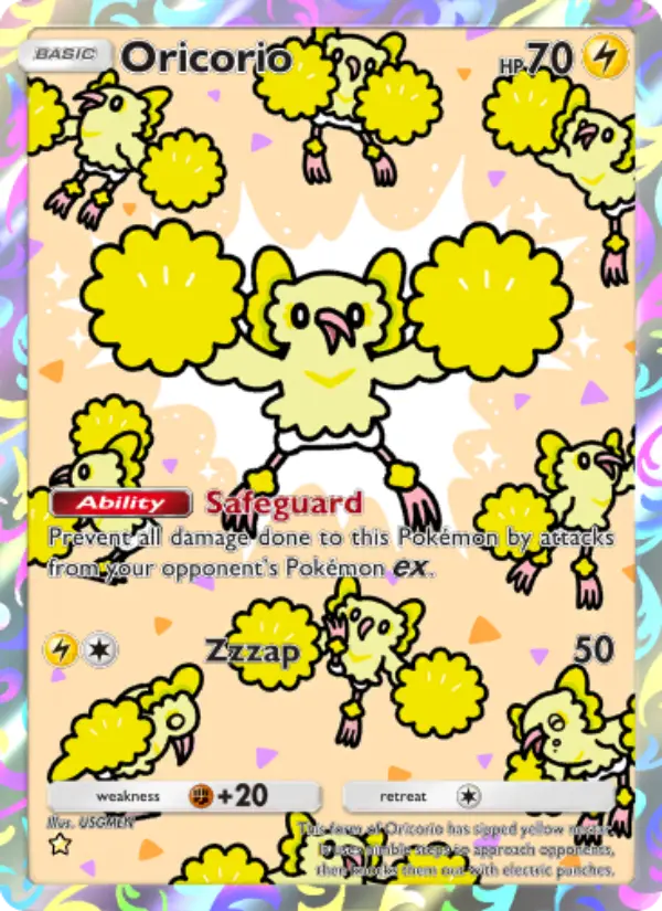 This form of Oricorio has sipped yellow nectar. It uses nimble steps to approach opponents, then knocks them out with electric punches.