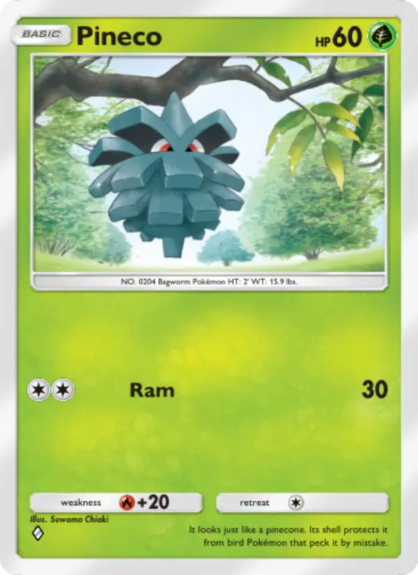 It looks just like a pinecone. Its shell protects it from bird Pokémon that peck it by mistake.