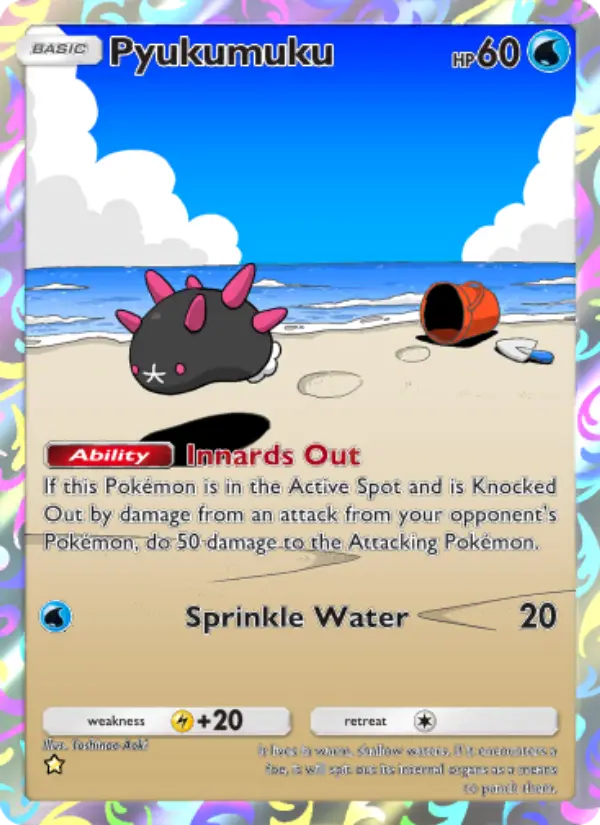 It lives in warm, shallow waters. If it encounters a foe, it will spit out its internal organs as a means to punch them.