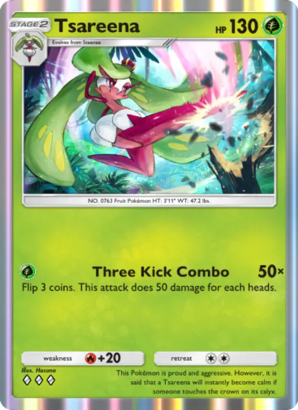 This Pokémon is proud and aggressive. However, it is said that a Tsareena will instantly become calm if someone touches the crown on its calyx.